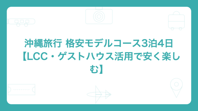 旅行 沖縄旅行 格安モデルコース3泊4日【LCC・ゲストハウス活用で安く楽しむ】 2026年4月4日 にちじょうくん https://nichijo-kun.com/wp-content/uploads/2023/06/e0d824005d10e951faaba64381519406-1.jpg にちじょうくんのブログ エメラルドグリーンの海・離島・美ら海水族館・沖縄料理と魅力たっぷりの沖縄。「飛行機代が高そう」「どこに泊まればいい?」という方向けに、格安 …